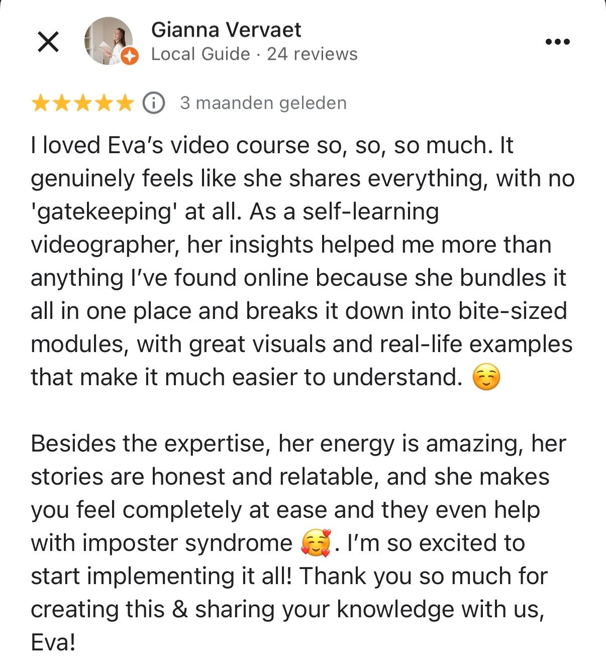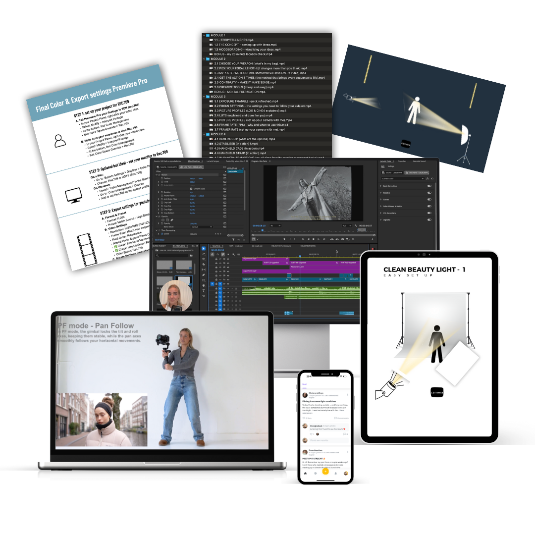 This isn’t dry filmmaking theory or a cinematography class - it’s real industry experience, simplified technical knowledge and skills that I use everyday to work with huge global brands - on my own. All put together in a clear, step-by-step framework so you never have to guess what comes next. Or if I’m really honest, I’m a bit fed up with all of the “filmmaker bro” cinematography courses and thought I could ad a feminine and fun approach ;)