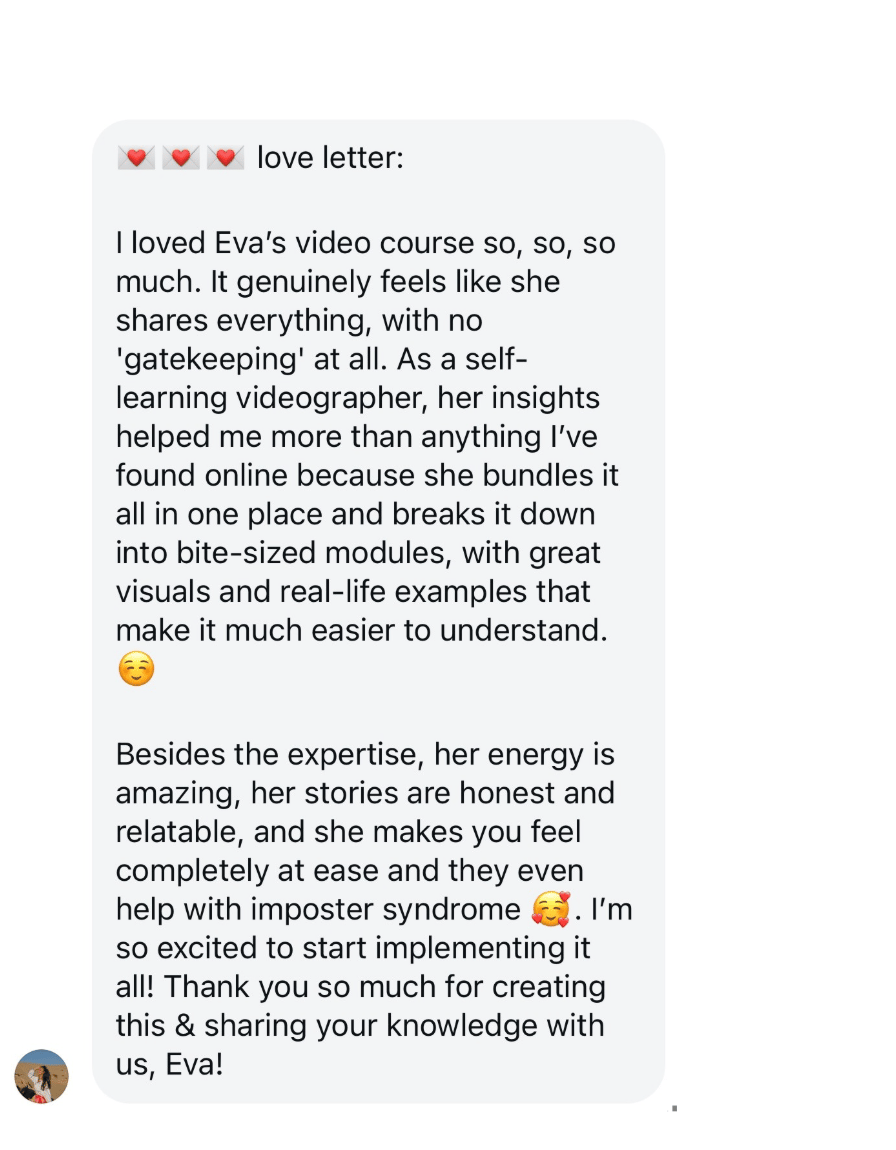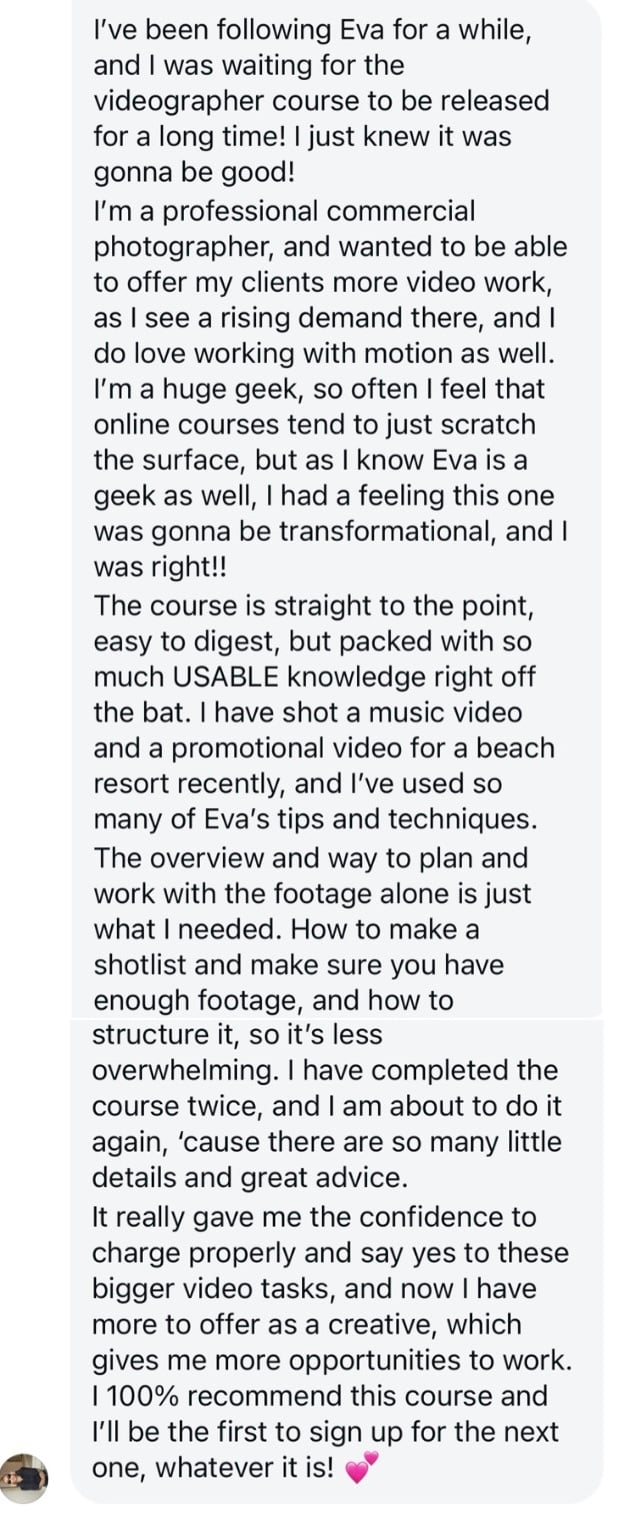 This is for creatives who see the power and potential of videography and want to jump on the wagon - whether you’re just picking up a camera for the first time or already working in the industry. I cover the essentials every videographer needs (and can’t live without), plus the pro techniques I’ve used in paid client work for years. Your level doesn’t matter - what does matter, is that you have a camera (or plan to get one) and access to editing software like Premiere Pro.